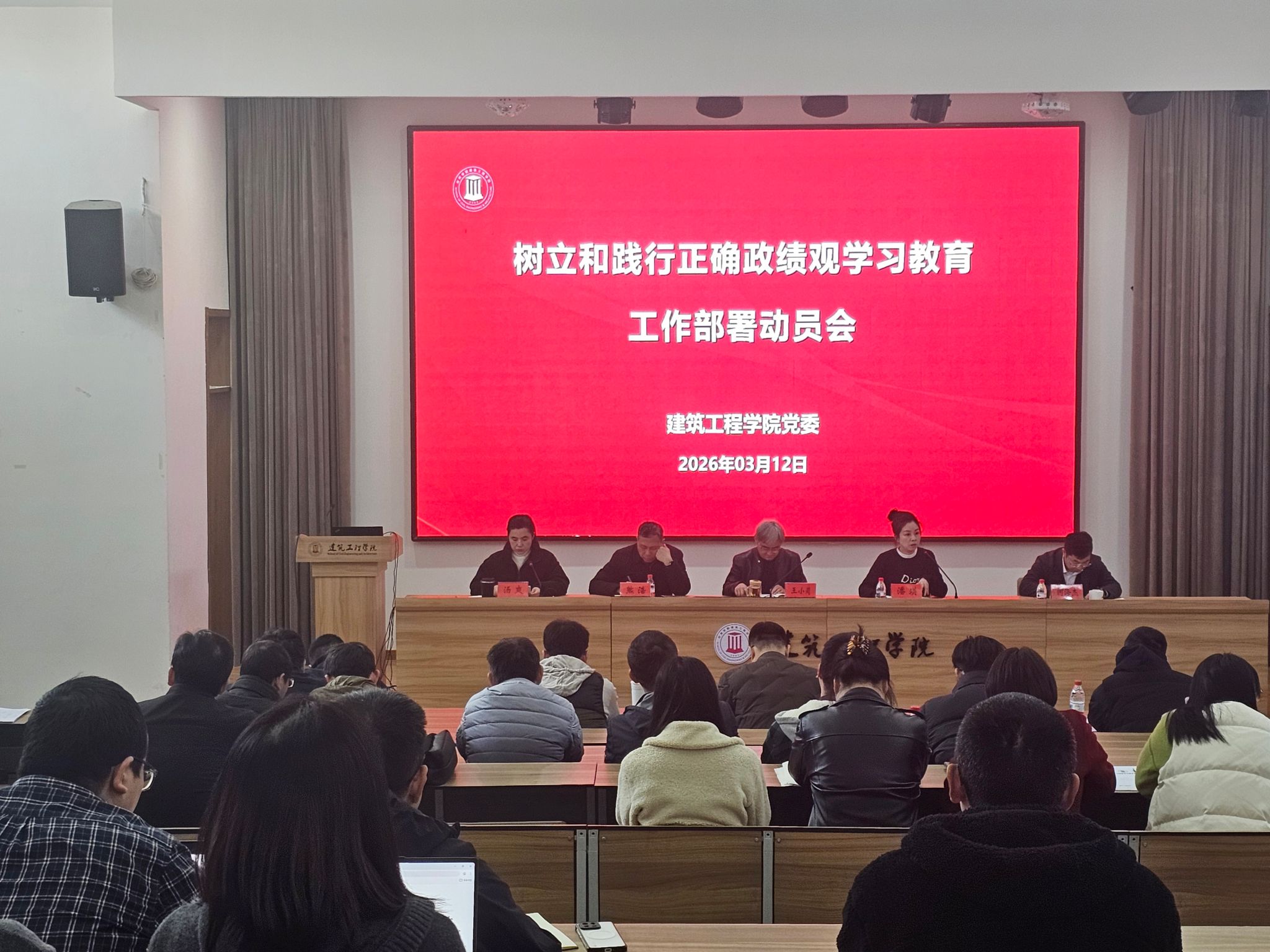 3月12日,建筑工程学院召开全院教职工大会,深入学习贯彻习近平总书记关于树立和践行正确政绩观的重要讲话和重要指示批示精神,全面落实学校党委(扩大)会议要求,对学院开展树立和践行正确政绩观学习教育工作进行动员部署。学院党委书记潘瑛主持会议并讲话,全院教职工参加会议。