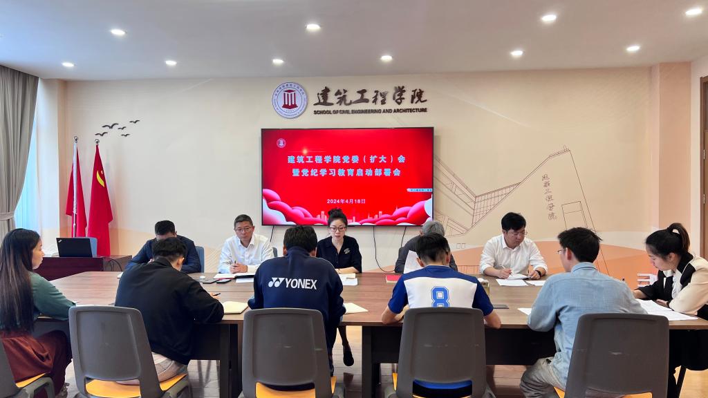 4月18日上午,建筑工程学院召开党委(扩大)会议,传达学习贯彻习近平总书记关于党纪学习教育的重要讲话和重要指示精神,贯彻落实中央、省委、市委党的建设工作领导小组会议精神和部署要求,组织开展学院党纪学习教育工作。学院党委班子成员和各党支部书记参加会议,党委书记潘瑛主持会议。