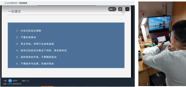 此次分享会给考研迷茫的同学打了一剂强心针,不仅提供了一个交流、学习的平台,有助于同学们做好考研复习规划,同时也增强了21土木专升本班级的学风和班级凝聚力。建筑工程学院一直以来高度重视学生考研工作,积极努力地创造条件引导学生考研,鼓励树立远大理想和志向,期待同学们抓住机会提升自我。