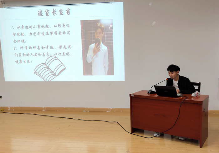 活动中,各位参赛寝室长都通过PPT从寝室卫生建设、文化活动、学风建设、朋辈影响以及寝室长职责等多个方面展开精彩陈述,展示了寝室建设的成果,分享了各具特色的寝室文化和丰富多彩的寝室生活。寝室长和其他寝室成员的暖心互动,更是给在场的观众和评委们带来了阵阵感动和欢笑。