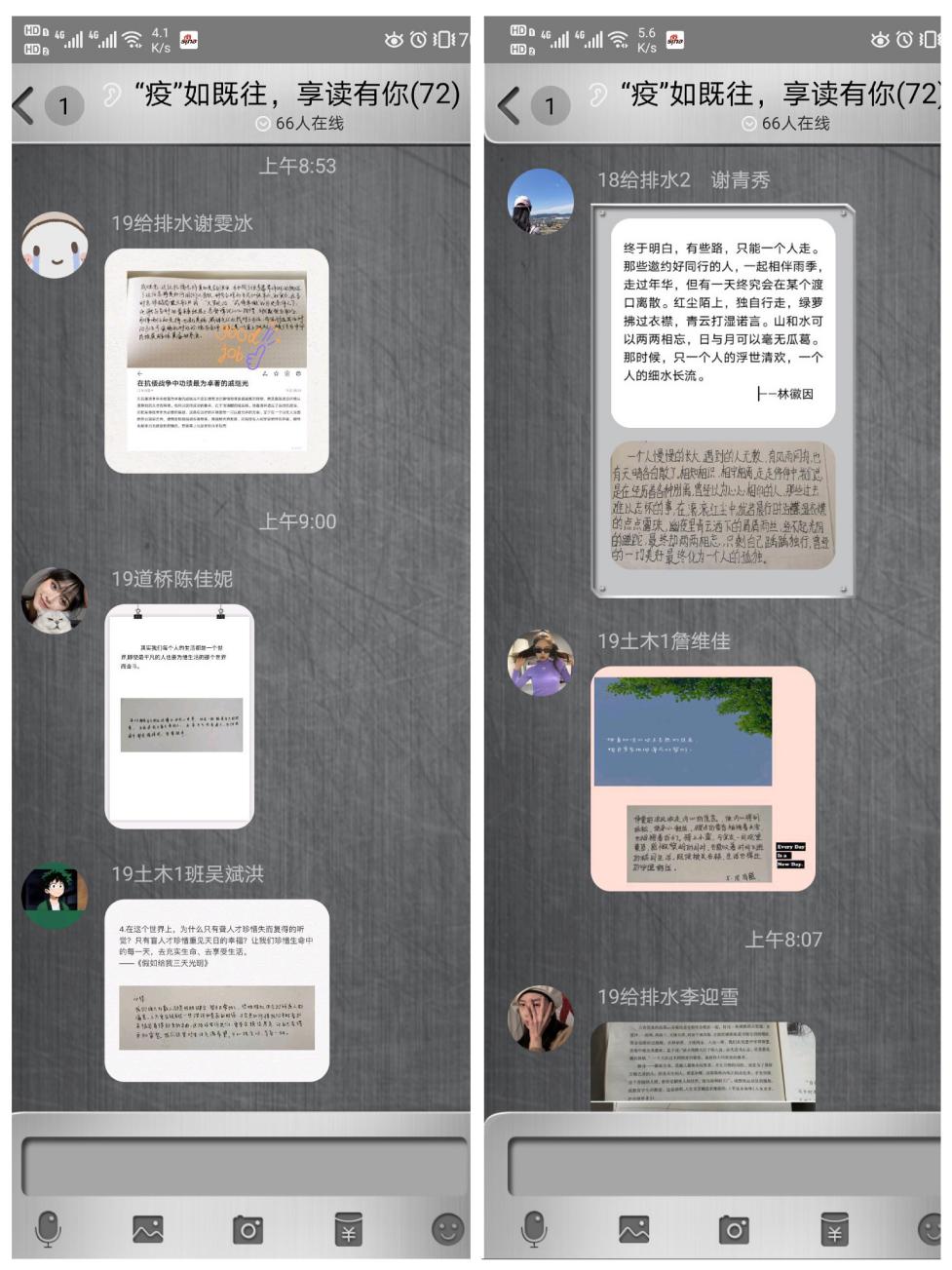 本次活动面向学院所有同学,参加者们进行“‘疫’如既往,享读有你——每日阅读打卡”活动,有的在线推荐喜爱的书籍,有的互相分享读过的正能量文章和看过的有意义的演讲、采访片段。对于推陈出新的活动形式与丰富多彩的活动内容,大家纷纷表示生活可以“宅”,但精神世界可以无限宽广,与书为友,使人明理,使人睿智,更能养浩然正气。