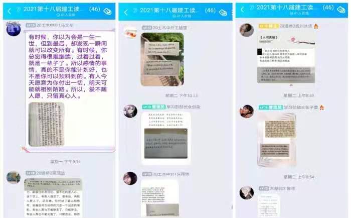 在读书会中,参赛者按时按量完成打卡,交流在阅读中的理解与思考。阅读内容涉猎十分广泛,有对生活的感悟总结、对未来的美好憧憬,也有对情感的细腻流露、对历史的品读回味。参赛者在打卡群中畅所欲言,各抒已见,也在交流和分享中,从另一个角度来看待自己所处的生活。活动最后,参赛者用一个音频或者视频对自己过去14天的阅读打卡活动进行总结,为期14天的主题读书会活动圆满结束。