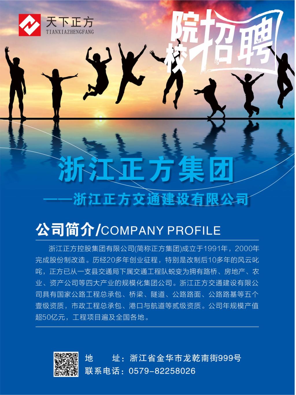 浙江正方交通建设有限公司是一家具有国家公路工程总承包一级资质,市政工程总承包二级资质。企业公司年规模产值超40亿元,工程项目遍及全国各地。公司连续八年被评为省建行信用AAA级企业,多次被评为人才开发先进单位、强优企业浙江省民营经济示范基地等称号,并于2005年被列为全国百强交通企业。公司以“正正方方做人、方方正正做事”为经营理念,实施以“观念为先、品质为主、才能为重”三者结合的人才引进战略,为人才的成长和发展提供了优越的环境,聚集了一批高素质和富有敬业精神的人才。通过数年的努力,取得了令人瞩目的成绩。