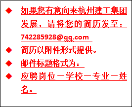 如果您有意向来杭州建工集团发展,请将您的简历发至:742285928@qq.com简历以附件形式提供。邮件标题格式为:应聘岗位—学校—专业—姓名。
