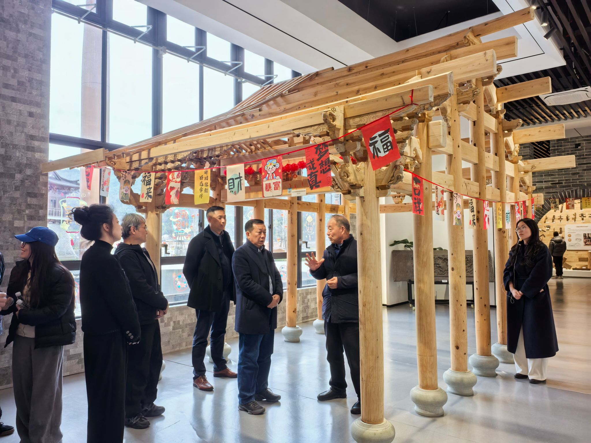 乐传永一行还实地考察了汇溪镇古建营造技艺博物馆的各个展区,了解馆内收藏的古建构件、营造技艺展示、非遗文化传承等内容,沉浸式感受汇溪古建文化的深厚底蕴与独特魅力。