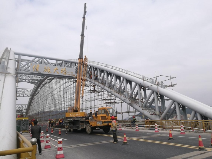 由我校承担的健跳大桥吊杆更换施工监控项目顺利推进,近日完成了最长吊杆更换的过程监控,精度控制在1mm以内。健跳大桥主桥为一跨245m中承式钢管混凝土肋拱桥,桥面宽22.5m,是华东独拱第一大跨。