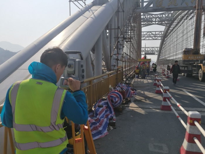 该桥已运行了16年,根据桥梁病害情况,需要进行更换吊杆,更换吊杆是难度极高的项目,需要精确的分析、精确的量测、精确的放样,监控是最核心的环节,确保项目达到设计目标、确保结构安全的关键环节。为此,三门县公路管理局委托我校滨海结构检测与加固技术研究所进行了关键技术的研究,并开展施工过程的精细化监控,项目总负责人为金辉老师,技术负责为邵国涛老师,部分学生也参与了线形测量。