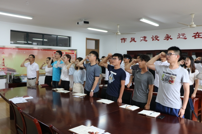 潘岳祥书记带领全体毕业生党员面对党旗,庄严宣誓:“我志愿加入中国共产党,拥护党的纲领,遵守党的章程……”,响亮的宣誓声响彻整个会场。