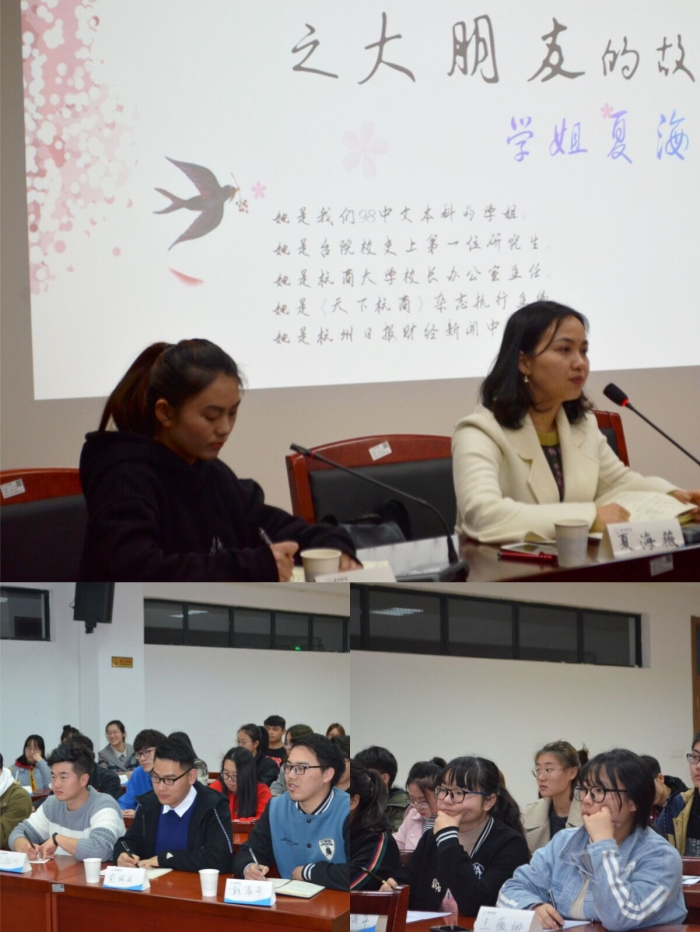 3月23日晚,杭州日报财经新闻中心副主任、杭商大学办公室主任、优秀校友夏海微应邀回母校做客“建工会客厅”,与建工学院各年级同学分享了自己的成长故事。学院党总支副书记郑晓莉及辅导员老师参加交流活动。
