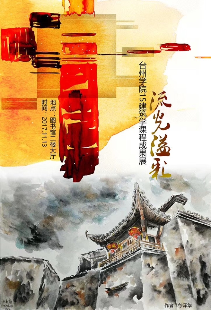 2017年11月13日~24日,“流光溢彩”——台州学院15建筑学课程成果展在台州学院椒江校区图书馆二楼大厅举办,主要展出一年来15建筑学全体同学的部分课程成果,主要涉及建筑设计、建筑模型、水彩画、建筑画、建筑速写等几部分内容。