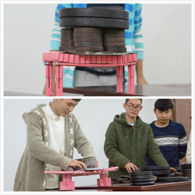 纸桥承重大赛是一项集创新、团队合作与动手能力于一体的趣味性比赛,历经四年传承创新,在赛制、组织流程等方面不断完善。本次大赛面向全校学生,有多达50支队伍参赛。比赛选手只用纸牌和胶水,做出承重最大的纸桥。经过激烈角逐,其中陈勇、张春伟、朱子浩的纸桥以承重61.5千克的优异成绩夺得桂冠;俞城成等五人获得二等奖;王椅红等八人获得三等奖。