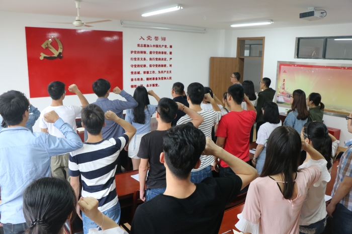 活动首先进行党员重温入党誓词宣誓仪式,全体毕业生党员面对党旗,紧握右拳,庄严宣誓:“我志愿加入中国共产党,拥护党的纲领……”。