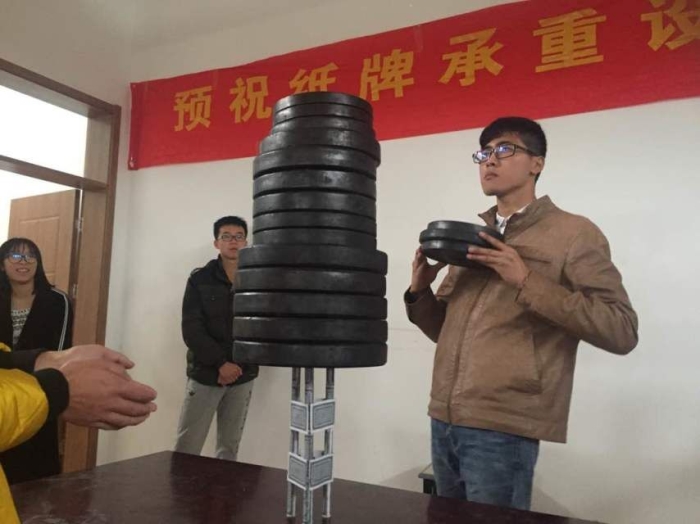 本次纸牌承重结构设计大赛,各学院同学以自由组队的形式报名,全校共有20余支队伍参加比赛,过程中通过对“纸牌建筑物”的外观、自身质量以及承重量等各项进行打分算出最后的总成绩。比赛开始,每组都认真地准备,充分发挥团队合作的力量,积极思考、勇于创新,分别用限定数量的纸牌架构出不同风格的“承压建筑”模型,不断挑战单位重量模型的最大承重压力。期间每一次砝码的增加都会引起阵阵惊呼,每一次砝码引起的结构倒塌都是内心的一次震撼,小小的纸牌竟然有如此之大的洪荒之力,真的是让人惊叹不已。最后,14土木冯从烈与14化学王倩倩所在队伍以54.7g自重承载82.5kg重量,总成绩97.5分的绝对优势获得此次大赛的一等奖。
