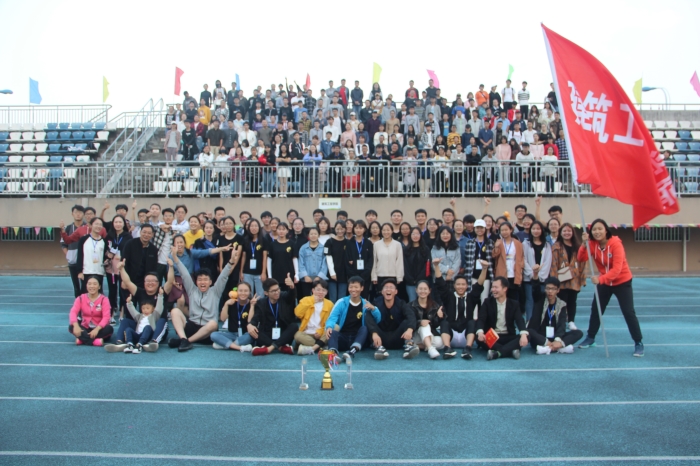 校体委副主任周瑶宣布比赛成绩,校长金则新宣布各项获奖名单。主席台上就坐的领导们为获奖的教工团体、学生团体和个人颁奖。在本次运动会中,我院的老师及学生都积极参与,凝心聚力,奋勇拼搏,处处展现建工“拼”的风范。不管是100m、200m、400m、铅球、跳高、跳远等个人项目,还是拔河、12人13足等团体项目,冠军的领奖台上总有建工人坚毅的身影。最终,建工学院凭借12枚金牌,以总分419分(第一)荣获此次校运动会团体总冠军。