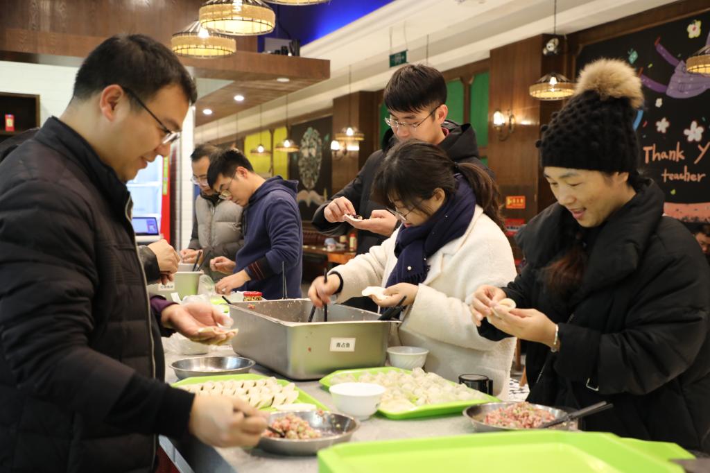 趣味运动会后,队员们移步教工餐厅,开始迎新年包饺子活动。来自五湖四海的教职工,包着属于不同地域特色的水饺,偶尔包上一个含有花生或者老干妈的水饺,寓意新年有个好彩头,欢声笑语,其乐融融。