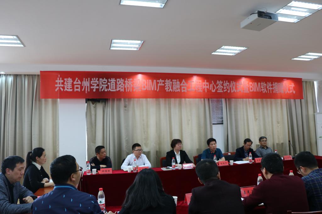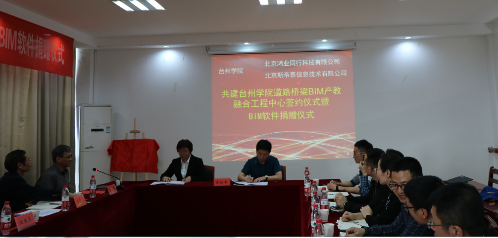 4月18日下午,我校与北京鸿业同行科技有限公司、北京斯帝慕信息技术有限公司共建台州学院道路桥梁BIM产教融合工程中心签约仪式暨BIM软件捐赠仪式在建筑工程学院隆重举行。副校长李钧敏出席并代表学校与企业签署了校企共建协议并为中心揭牌。建工学院院长王小岗代表学校接受企业价值363.44万元的软件及服务捐赠。地方合作处处长王金宝、国有资产与实验室管理处处长林海斌、建工学院班子成员及师生代表参加签约仪式。