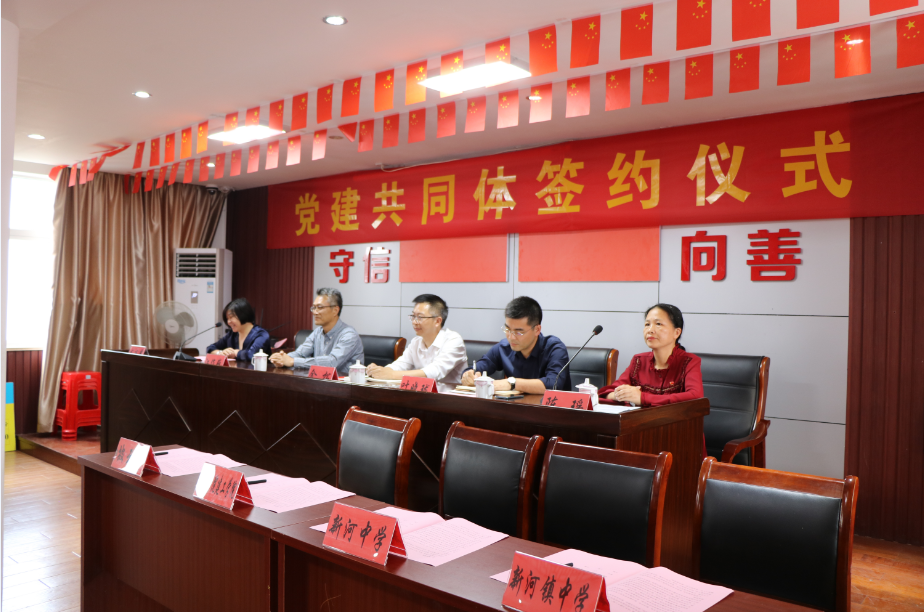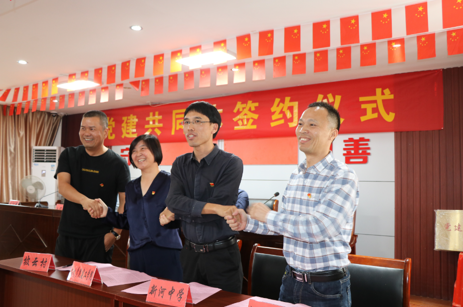 潘岳祥宣读党建共同体协议书,新河镇披云村党总支部书记、台州学院建筑工程学院总支部书记、新河中学党委书记、新河镇中学总支部书记进行了“三校一村”的党建共同体签约仪式。