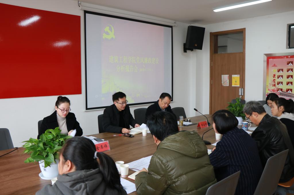 12月25日上午,建筑工程学院在学院党员之家召开2019下半年党风廉政分析会,校党委委员、宣传部长金松,校纪委副书记、纪检监察室主任李友富出席指导,学院班子成员、各系主任、办公室和实验中心主任参加,分析会由党总支书记金凌虹主持。