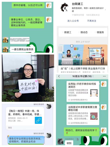 年后,本来是毕业班同学应聘就业的黄金期,突如其来的疫情打乱了2020届毕业生就业的节奏。为了缓解大家在疫情期间的就业顾虑与压力,做好就业工作服务,在负责所在年级的疫情防控工作的同时,蒋静逐一梳理了2020届未就业的学生名单,建立精准就业对接的微信群、QQ群,动态了解就业进度,指导大家提升就业能力。同时,蒋静积极推进“线上招聘”模式,利用自己建立的200余家用人单位信息库,主动联系了解复工情况和招聘意向,收集到近50多条招聘信息,为学生就业铺路搭桥。在了解到毕业班同学多样化需求后,蒋静第一时间整理材料,在“台院建工”公众号发布毕业生工作专题推送,指导毕业班同学各项就业工作。“如有任何疑问,你们可第一时间联系我”,这是疫情期间蒋静和学生们说的最多的一句话。