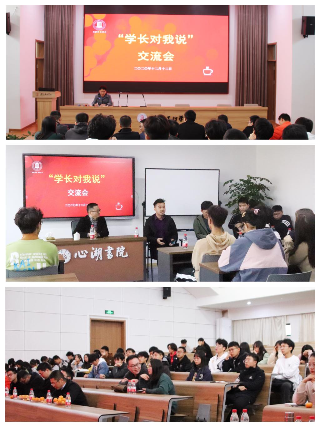 下午,“学长对我说”专业交流会分别在学院学术报告厅、心湖书院举行。校友们分析了自己毕业以来的经历,分享了自己的成长故事和人生感悟体会。勉励学弟学妹们珍惜大学的学习生活,合理安排时间,树立人生规划目标,学好专业知识,掌握专业技能,要不怕失败、不怕出错、多学多问,懂得取舍、才能在毕业后不断成长、不断进步。互动环节中,学院学生积极提问,校友们耐心细致回答了大家的疑问和困惑,让同学们受益匪浅。