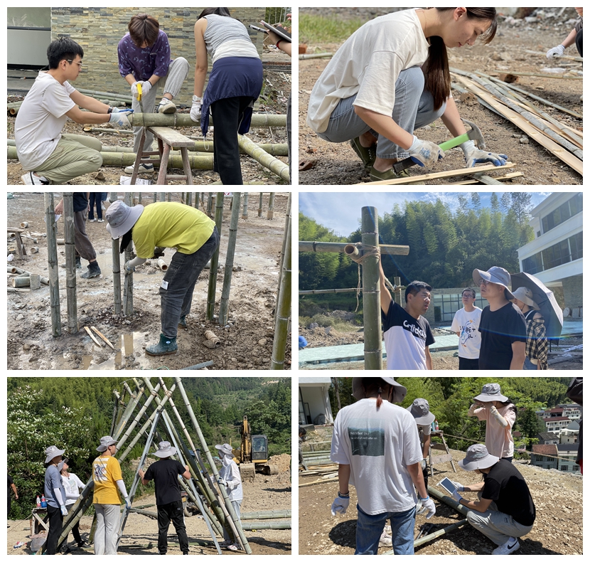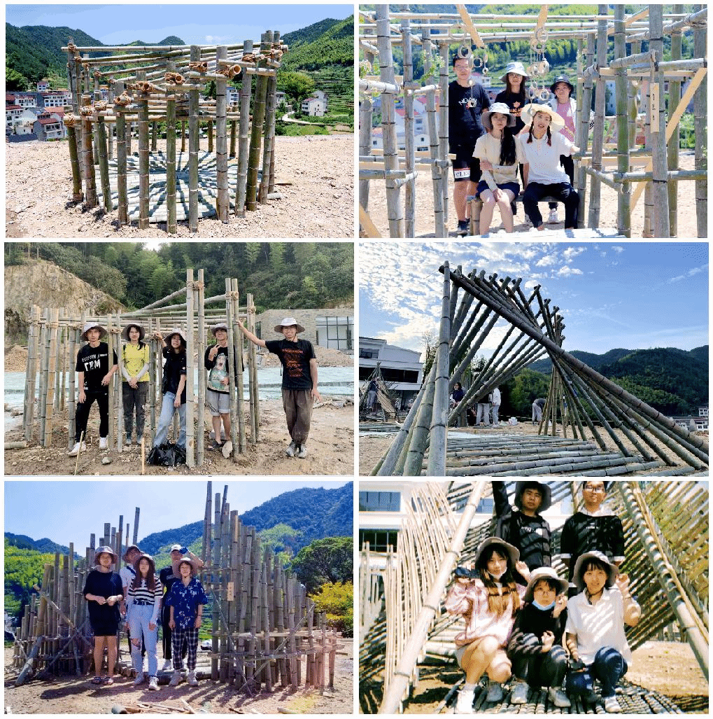 课程主要分两块内容,首先进行方案设计,其次开展实际建造。同学们分小组协商,几经头脑风暴、多次修改方案,带着概念信心满满来到山上。实际搭建过程中,经历山上毛竹砍伐不力、运输困难,而后搭建场地先经暴雨洗礼后经烈日暴晒等重重难关,同学们也从沮丧、妥协到最后坚定信心。工作中不分男女,砍刀、锯子、扳手、起子、螺丝刀……各种五金工具使出十八班武艺,最终呈现了高质量的竹构建成果,获得了实习巡视老师和当地村民的一致赞誉。本次共搭建“里岙烟火”、“竹里馆”、“倒梦空间”等6个中大型构件,将作为里岙村一处景观留存里岙村紫泽山在建高档民宿前,致敬现代建筑艺术,致敬党建百年。