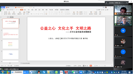 为进一步提升我校学生参赛水平,8月18日上午,应创业学院和建工学院特别邀请,浙江财经大学王阿蒙老师,对“垦荒杯”台州学院2021年大学生乡村振兴创意大赛之人文公益类进行在线辅导。