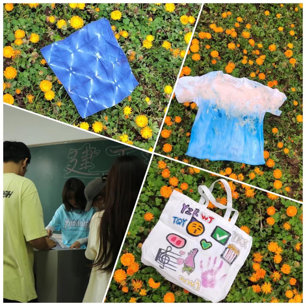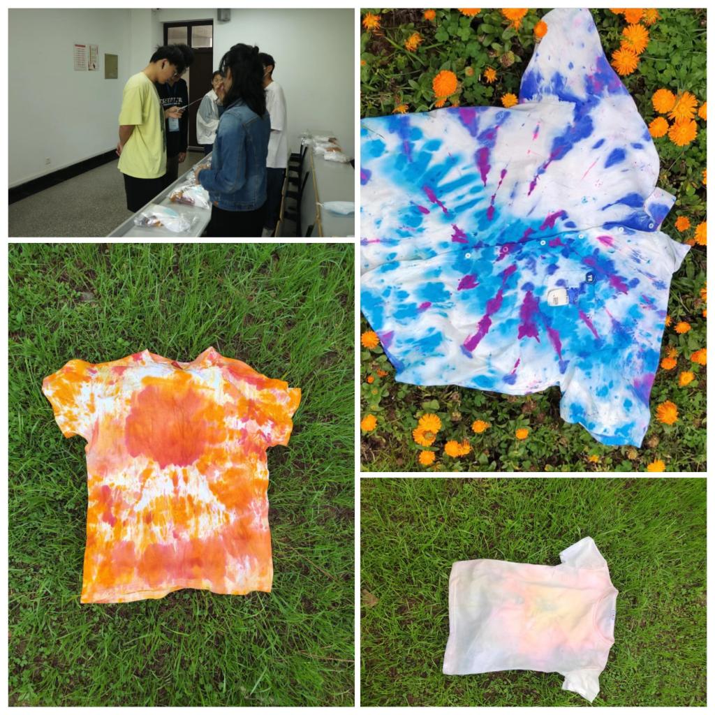活动中,来自各个学院的同学自由组队,领取扎染材料。各组同学充分发挥自己的想象力与创造力,以独特的想法与巧妙的手法相结合,或五彩樱花、或蔚蓝大海、或火红朝阳,以三色扎染的一件件作品,承载着同学们智慧,也寄予了他们对美好事物的向往。