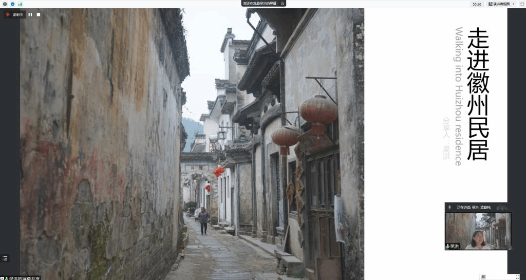 吴洪博士从她个人学习建筑学经验和民居学习经历展开分享,并对现阶段的学习提出了建设性的建议。她通过实地考察,用建筑学的眼光对于呈坎村的所见所闻所感,通过大量的实地图片和测绘图纸,结合《皇帝宅经》《徽州建筑》等书籍,向大家解释了如何用传统思维来看待传统聚落的构建。同学们对呈坎村及乡村的问题与吴洪博士进行了沟通交流,如《皇帝宅经》与建筑与人之间存在着的对应关系如何体现的,徽州民居建筑构造的搭接与浙江台州的海门老街民居有何共同之处等。
