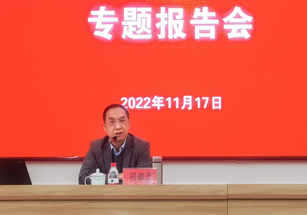 宣讲会上,胡韶光以个人对中国式现代化建设的理解为主题,纵横古今中西,以大量详实的史实、数据,深入浅出、具体生动地阐述了党的二十大精神内涵。胡韶光说,党的二十大是在全党全国各族人民迈上全面建设社会主义现代化国家新征程、向第二个百年奋斗目标进军的关键时刻召开的一次十分重要的大会,科学谋划未来5年乃至更长时期党和国家事业发展的目标任务和大政方针。他以中国农村改革、中国迈向世界创新型国家行列的历程等鲜活案例强调了建国以来、特别是党的十八大以来的伟大成就。胡韶光强调中国式现代化是人口规模巨大的现代化、是全体人民共同富裕的现代化、是物质文明与精神文明共同发展的现代化、是人与自然和谐共生的现代化、是走和平发展道路的现代化。胡韶光指出,个人命运与国家命运紧密相连,每位师生都要学习二十大精神,紧贴国家发展脉搏,希望老师和同学们抓住时代发展的脉搏,把个人职业发展与国家社会发展融合在一起,以中国式现代化全面推进中华民族伟大复兴。