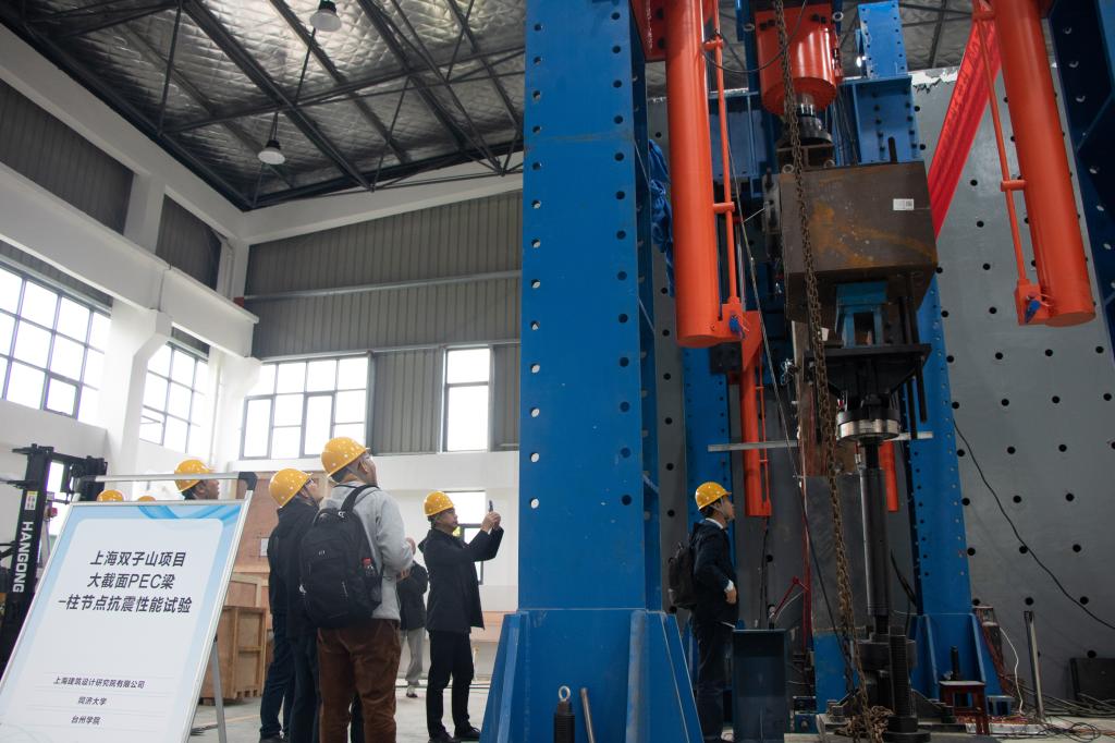一行专家听取了建工学院副院长熊浩对实验中心建设情况的介绍,对中心的配置、运行和管理机制予以高度评价,并重点就我院承担的“上海双子山PEC梁柱节点抗震性能试验”项目进行了深入探讨。项目负责人杨克家老师汇报了目前项目进展情况,专家们针对前期试验中出现的焊缝断裂问题提出了实际解决方法,形成节点设计优化方案。