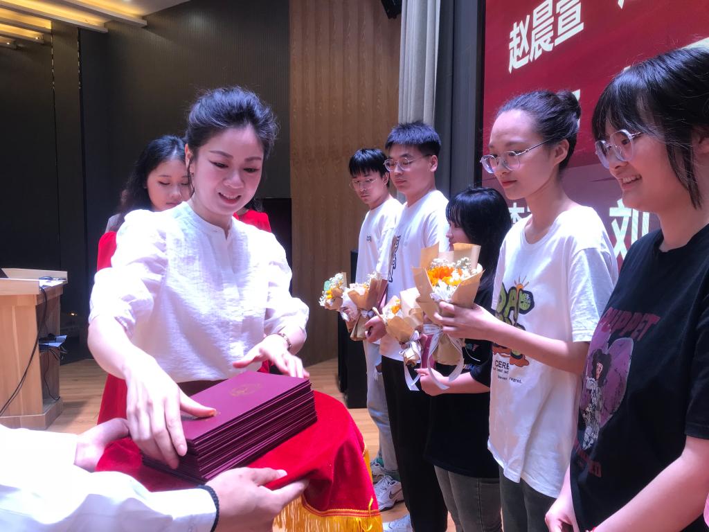 党委书记潘瑛给优秀毕业生代表送上鲜花和表彰证书