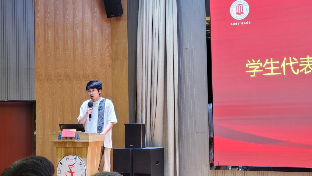 谭浩强代表教师发言,希望同学们尽快从学生到职业人的转化,主动适应和把握人生新的赛道,持续学习,完善自我,努力奋斗,热爱生活,打造属于自己的多彩人生。毕业生代表徐宏航回忆了精彩纷呈的大学学习生活,感恩母校的培养教育,对未来人生充满了美好期许。