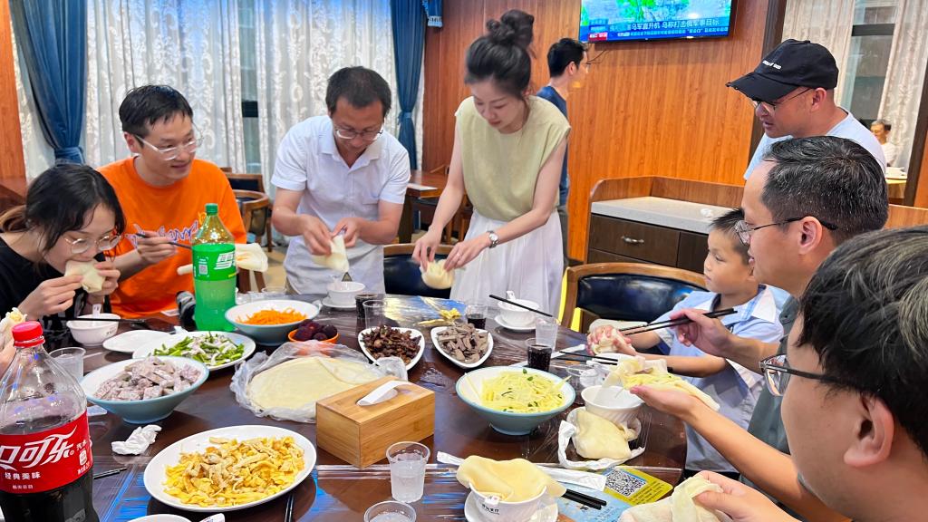 闰六月的初夏,校园内绿风冉冉,草木葱茏。下午三时,校园健步走活动拉开帷幕。大家漫步校园绿道,欢声笑语撒满沿途,在享受美好时光和清新空气的同时,陶冶情操,锻炼身体。之后,在学校教工食堂举行包食饼筒活动。食饼筒是台州特色美食,也是端午佳节台州家家户户必备的传统饮食。食饼筒包法看似简单,实则容易“露馅、断裂”,台州籍老师们纷纷主动担当“指导教师”,为大家指点包法,忙的不亦乐乎。