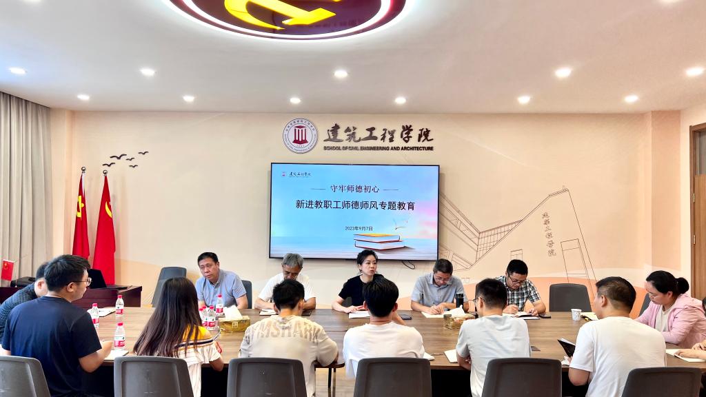 9月7日下午,建筑工程学院党委召开新进教职工师德师风专题学习教育会,为新教师把好“师德师风第一关”,要求新教师守牢初心,珍惜身份,敬畏岗位,爱惜羽毛,成长为优秀的“建工人”。全体2023年新进学院教职工参加学习讨论,党委书记潘瑛主持。