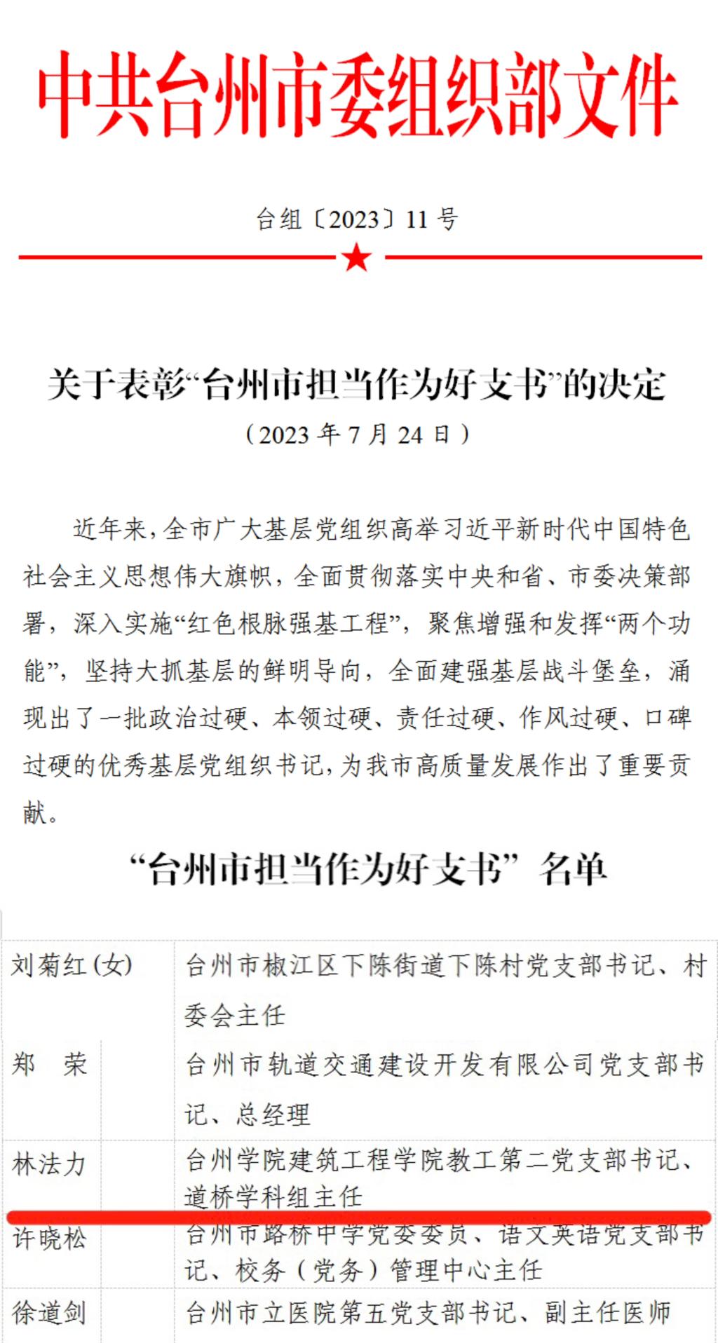 日前,台州市委授予一批政治过硬、本领过硬、责任过硬、作风过硬、口碑过硬的优秀基层党组织书记“台州市担当作为好支书”荣誉称号,我校建筑工程学院道桥教工支部书记林法力同志获此荣誉,是市直高校的唯一代表。