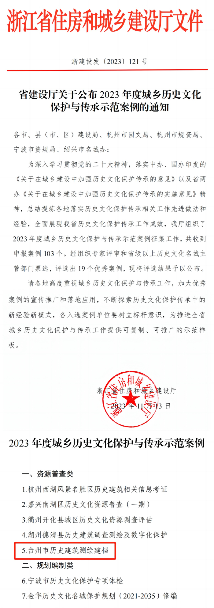 日前,为总结提炼浙江各地落实历史文化保护传承相关工作先进做法和经验,全面展现浙江历史文化保护传承工作成效,浙江省住房和城乡建设厅通过组织专家和省级以上历史文化名城主管部门对103个申报案例进行评审。其中,建工学院“台州市历史建筑测绘建档项目”获评浙江省2023年度城乡历史文化保护与传承示范案例,为5个资源普查类示范案例之一。
