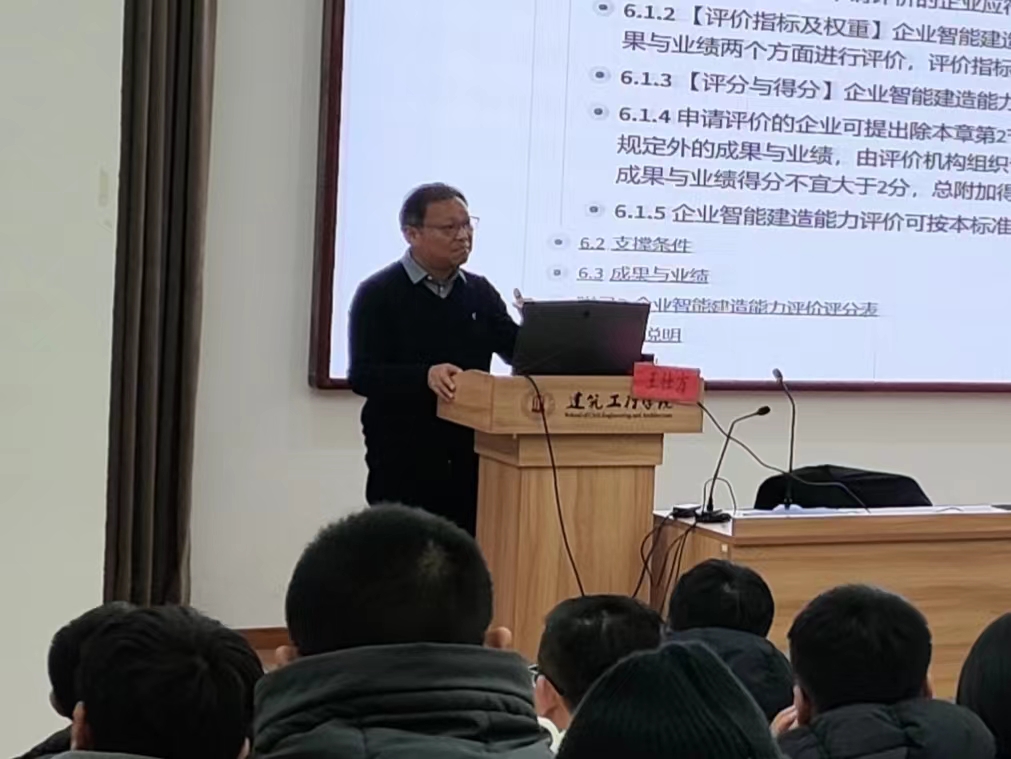 本次培训在我校建工学院学术报告厅举行,邀请中国工程建设标准化协会智能建造专委会常务委员、浙江省工程建设质量管理协会副秘书长、浙江省建筑业现代化台州产业学院执行院长王仕方教授,以及浙江省土木建筑学会工程管理学术委员会委员、建工学院土木系主任肖磊副教授,分别作《智能建造实践与探索》、《智能建造初级阶段企业转型路径思考——基于示范项目评审视角》报告。