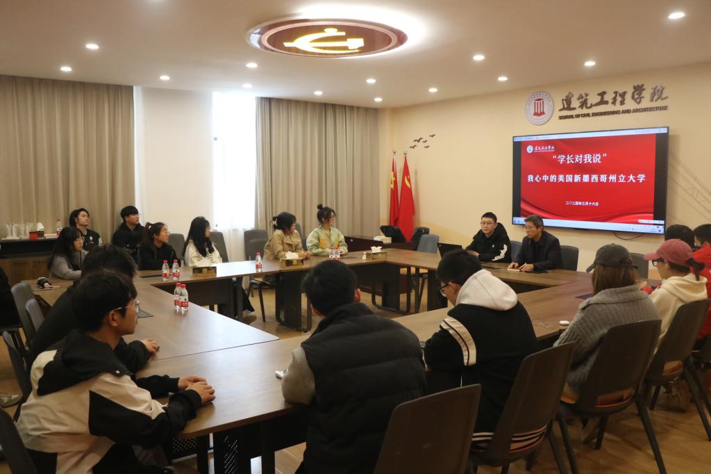 为更好地帮助建工学子了解出国留学选择,3月16日,建工学院在党员之家举行“学长对我说:我心中的新墨西哥州立大学”交流会,学院党委副书记林霖主持,美国新墨西哥州立大学研究生、17级土木工程翁涛主讲,辅导员薛军新与近30位同学参与会议。