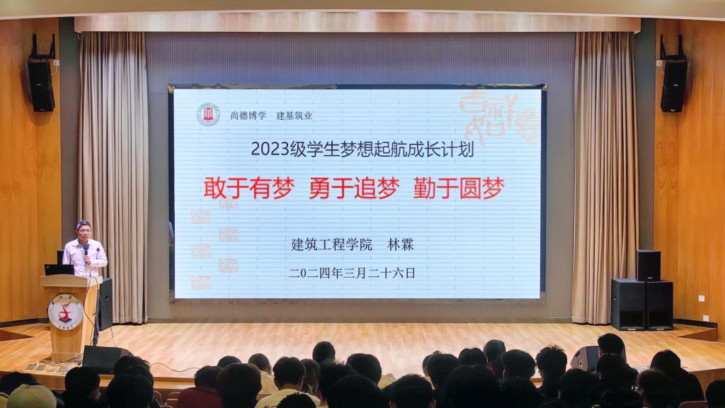会上,林霖从人文素质提升行动计划、职业能力提升行动计划、“问题”学生帮扶行动计划、先锋领航拔尖学生成长行动计划等四个维度全面介绍梦想起航成长计划,强调学院始终坚持以“三全育人”统领学生工作,重视全员全方位全过程育人,鼓励同学们要立大志、明大德、成大才、担大任,努力成长为“知识、素质、能力、人格”四位一体的应用型复合型人才。20建筑学李欣以规划为关键词分享了自己的成长收获,23给排水科学与工程专业练晶晶讲述了自己入校以来的试错成长故事,23建筑学班主任沈晶晶老师希望同学们以梦想为帆,行动为基,与时间赛跑,奋力抒写自己的青春故事。