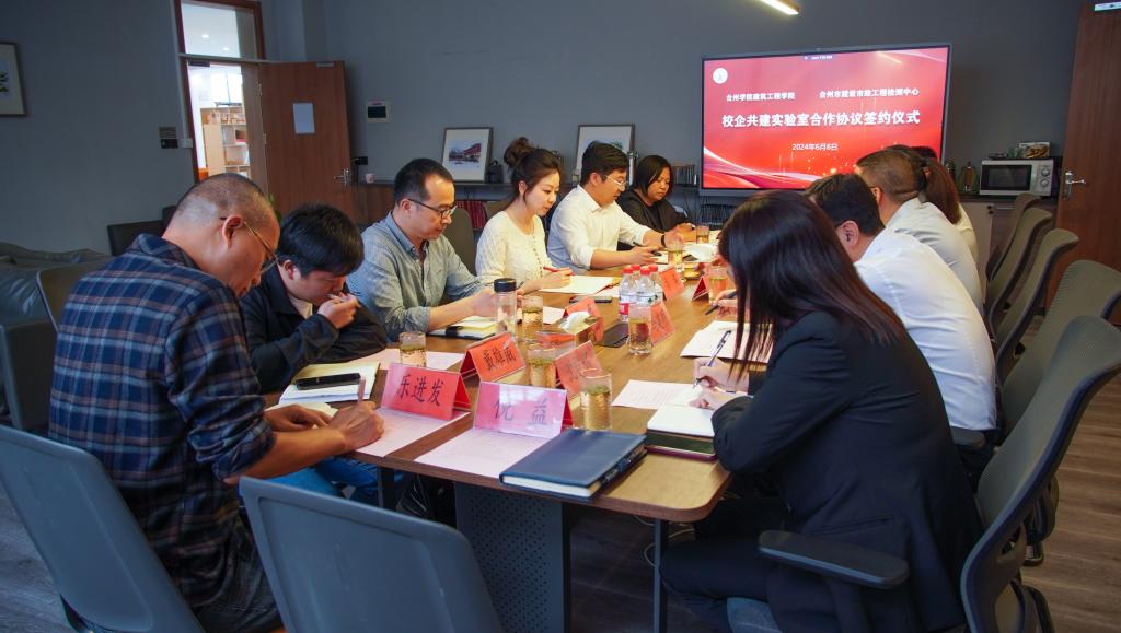 6月6日下午,建工学院与台州市城投市政工程检测中心有限公司举行校企共建合作协议签约仪式。院党委书记潘瑛、教师代表、台州市城市建设投资发展集团党委委员、总工程师顾勇军、总经理马建明、顾问罗雪萍等参会。副院长何海杰主持会议。