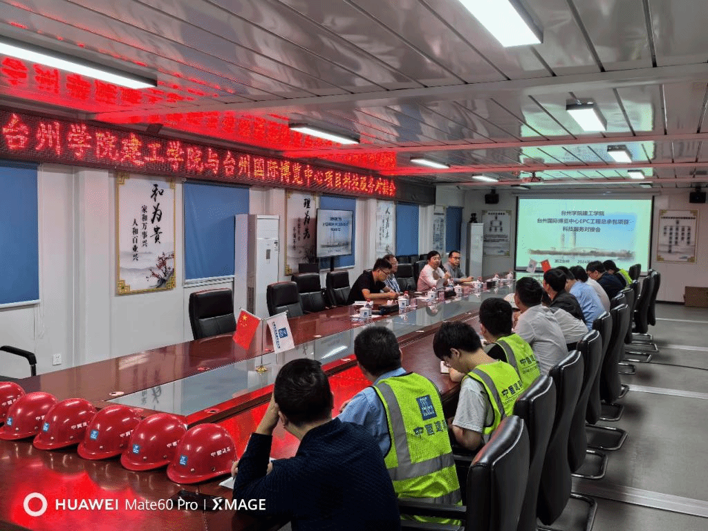 在中建四局建设发展有限公司浙江分公司总工程师韩伟伟的带领下,何海杰一行对国博中心项目进行了现场观摩。随后,在中建四局台州国际博览中心项目部举行了台州学院建工学院台州国际博览中心工程总承包项目科技服务对接会。韩伟伟详细介绍了公司的组织结构、项目承包情况、人才招聘计划以及未来人才需求,表达与学院加深合作的意向。