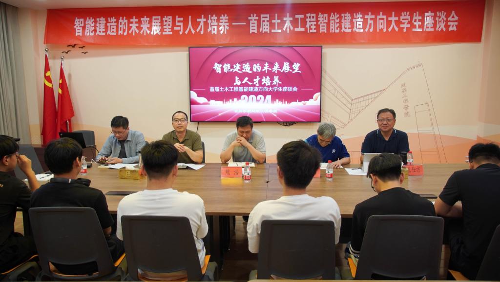 随着信息技术的飞速发展,智能建造已成为土木工程行业的重要变革力量。为深入探讨智能建造技术在土木工程领域的革新应用、分享教育实践成果,并展望行业发展趋势,2024年6月24日晚,“智能建造的未来展望与人才培养——首届土木工程智能建造方向大学生座谈会”在建工学院党员之家举行。本次座谈会旨在激励学生紧抓时代机遇,深化专业素养,提升实践技能,为智能建造行业的可持续发展蓄力储能。