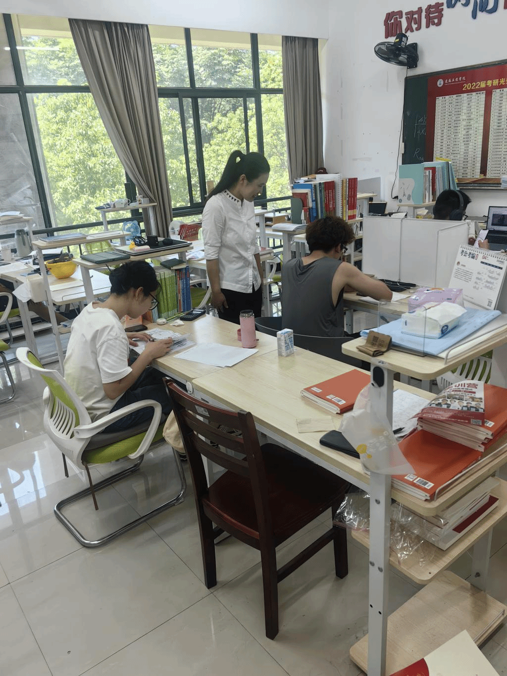 在考研教室里,老师们详细询问每一位同学的学习和生活情况,深入了解他们在暑假期间的自主学习计划、备考进度以及遇到的困难,并对同学们提出的各种问题进行了详细的解答。