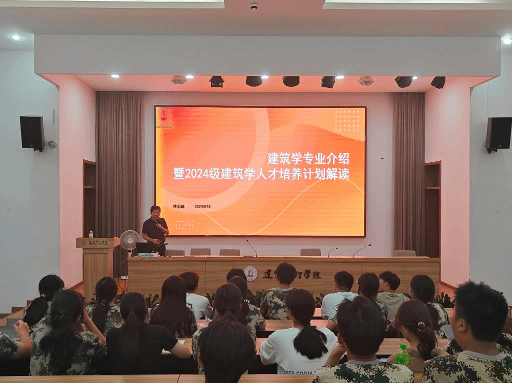 为深化2024级建筑学新生专业认知,稳固专业思想,了解专业方向,9月23日晚,建筑工程学院建筑学专业介绍暨2024级人才培养计划解读会在建工大楼报告厅举行。本次大会由建筑学科组主任、支部书记林新峰老师主持,建筑学学科组教师代表及全体24级建筑学新生参加。