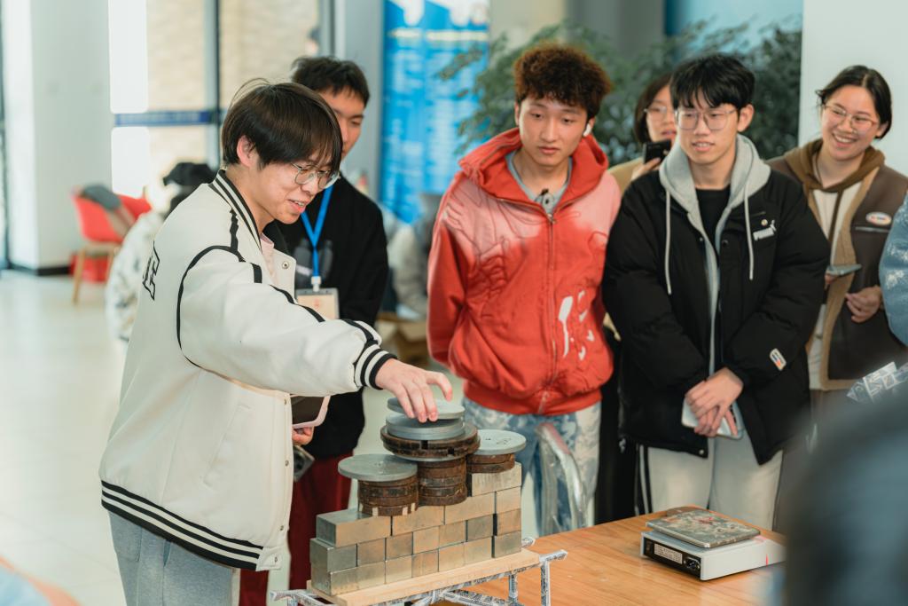 外观评分环节中,刘军定、沈一军两位老师从桥梁的美观性、创意性和结构合理性等方面进行专业评估。参赛作品形态各异,构思巧妙,充分展现了建工学子的创新思维和专业能力。承重测试环节,由参赛队伍自行加载砝码,测试纸桥的承载极限。其中一支队伍的作品承重能力高达60公斤,桥梁依然保持稳定,赢得全场观众的热烈掌声。