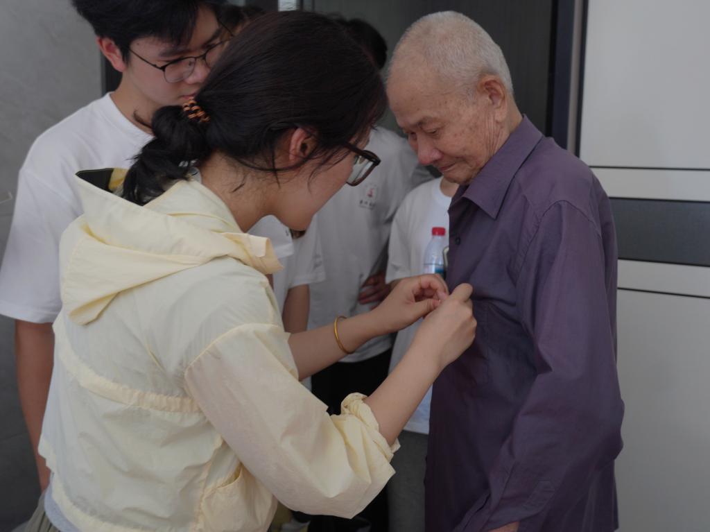 ▲实践队员为林世友老先生佩戴党员徽章