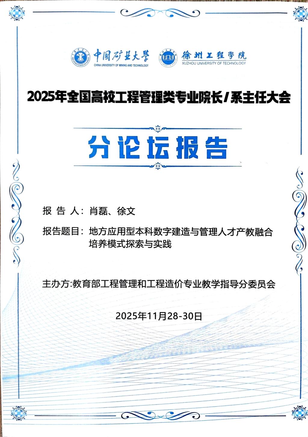 除学生竞赛成绩突出外,肖磊、徐文两位教师也应邀在大会分论坛上作专题报告。他们以《地方应用型本科数字建造与管理人才产教融合培养模式探索与实践》为题,分享了我校在数字建造与管理方向的人才培养理念、课程体系建设及校企协同育人方面的实践经验,获得了与会专家的高度关注与积极反响。