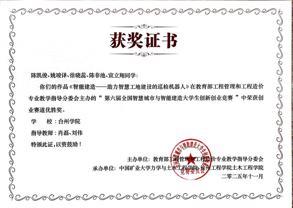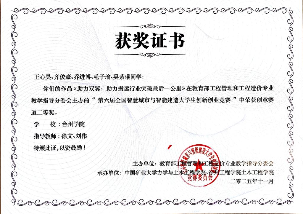 同期举办的全国智慧城市与智能建造大学生创新创业竞赛,是教育部工程管理和工程造价专业教指委主办的唯一国家级赛事,受到多所重点高校的高度关注。由台州学院建筑工程学院肖磊、刘伟、徐文三位老师指导,王心昊、齐俊豪、乔进博、毛子瑜、吴紫曦等五位同学共同完成的参赛作品《助力双翼:助力搬运行业突破最后一公里》,荣获全国二等奖,该作品聚焦可穿戴式外骨骼机械臂的研发,致力于解决搬运行业“最后一公里”的实操难题,为推动搬运作业智能化、提升智能建造水平提供了创新思路与实践方案;陈凯俊、姚竣译、徐晓蕊、陈非池、宣立翔等五位同学共同完成的参赛作品《智能建造—助力智慧工地建设的智能巡检机器人》,荣获全国优胜奖,该作品聚焦建筑工地的智能化巡检与安全监控,结合人机交互、路径记忆、自主学习、红外感知与高清监测,提供高效的巡检与实时数据反馈,提升工地安全性、效率和自动化水平。