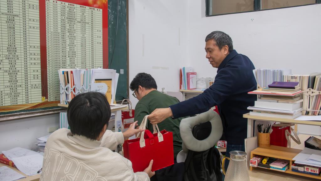 发放活动现场气氛温馨热烈。学院领导、辅导员将一份份精心准备的礼包递到考研学子手中。礼包内不仅有寓意“妙笔生花”的考试专用文具套装、“能量满满”的定制款可乐与营养食品,更有印有“一‘建’如故,金榜题名”、“功不唐捐,玉汝于成”等励志寄语的专属祝福卡片,每一处细节都凝聚着学院师生对考研学子们的殷切期望和美好祝愿。