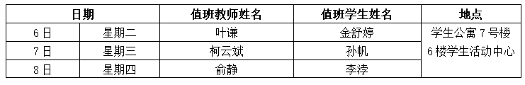备注:1.为深入实施“大思政”理念下学院“三全育人”体系的构建和实践,推进“思政工作进公寓、学业指导在公寓”工作,本学期继续开展“教师进公寓工程”,即每周一至周四晚(19:00——21:00)安排一名教师进公寓,节假日不安排,教师可结合自己联系寝室、授课学生,通过个别谈心谈话、集体交流座谈等形式加强对学生的生活指导、学习指导、职业生涯指导、就业创业指导、心理健康指导等,满足学生成长需求。2.“教师进公寓工程”由学院学工线牵头,教师安排之日如临时有事,请做好与学工线联络工作或和其他老师调换下公寓时间安排。3.教师公寓联络人李鑫老师,组织做好值班、填写发布每周安排表、联系下公寓教师,并做好相关记录、拍照等。教师交流结束后,请自行做好相关表格登记(值班学生做好提醒)。